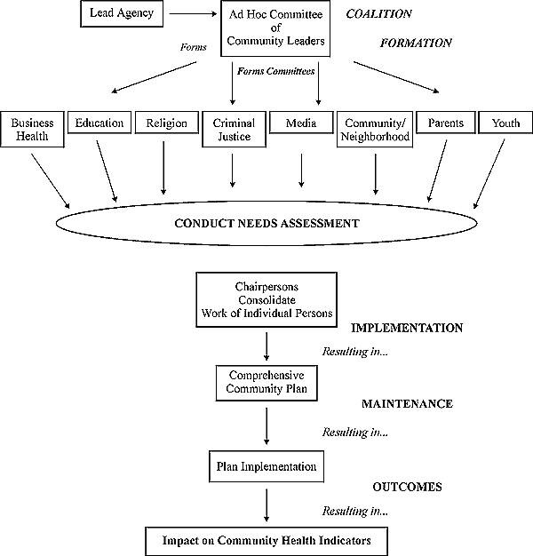 One of the most common ways of looking at partnerships is by identifying their stages of development and the main activities associated with each phase. (One such framework is presented in Appendix B, the representation of a community coalition organized to prevent alcohol and other substance abuse.) The most complete descriptions of partnership formation, implementation and maintenance are found in implementation manuals designed to guide communities and organizations as they create and manage partnerships.(28) By combining the advice presented in these manuals, we have identified a series of steps that are important to partnership-building efforts. We have used these steps to organize factors that were observed to contribute to or obstruct the development of partnerships in the literature on the functioning of actual partnerships in teen pregnancy prevention and other fields. The processes involved in forming and sustaining partnerships frequently do not occur in sequence but occur simultaneously and repeatedly over the lifespan of the partnership.(29) However, for the purposes of exposition, we present them as a series of sequential steps.