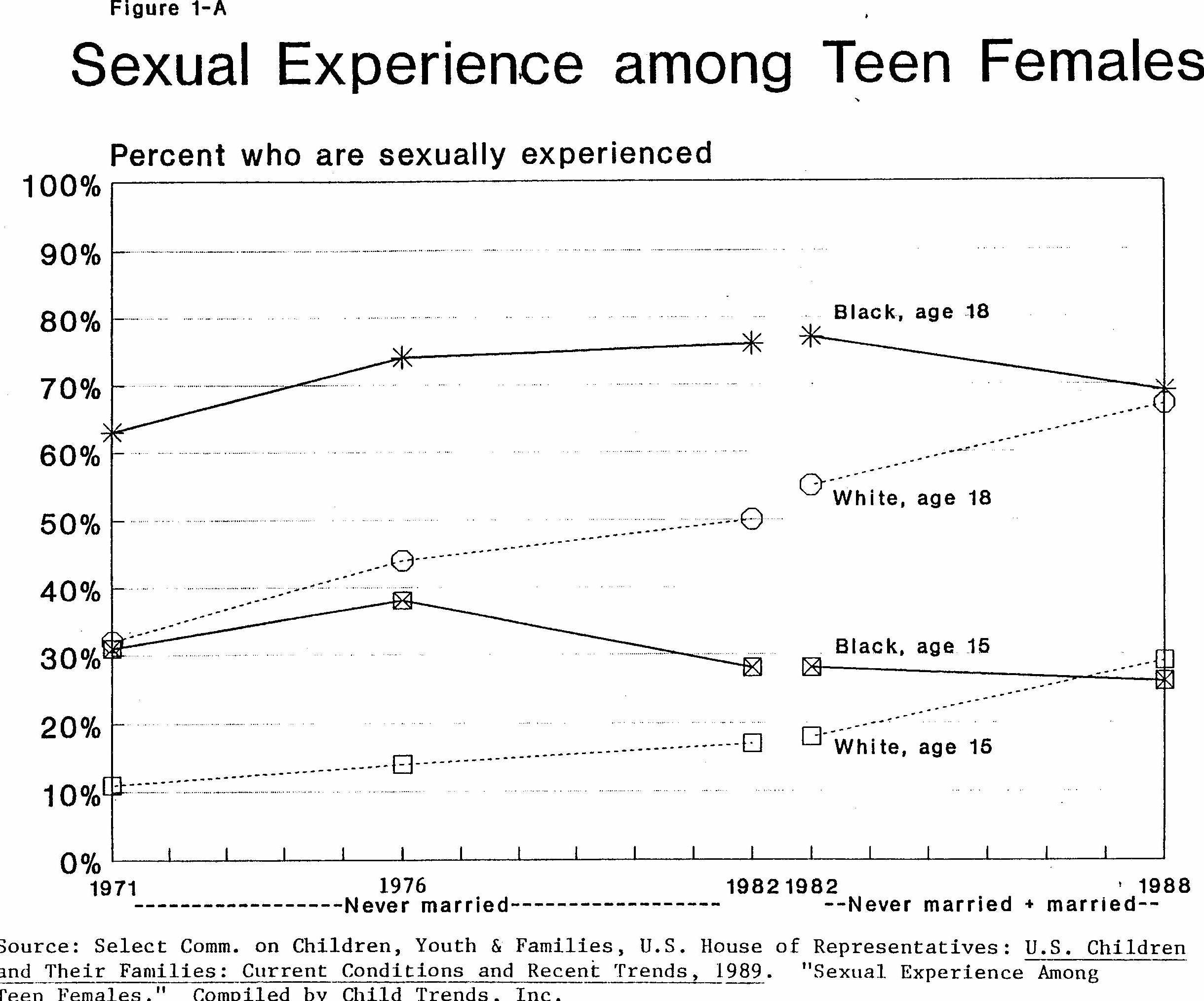 Figure 1-A depicts levels of sexual activity among female adolescents aged 15 and aged 18 between 1971 and 1988. Unfortunately, data are not yet available that can provide a clear time trend. Thus data for the time period 1971-1982 cover a different sample than the data for 1982 and 1988. Comparing the two 1982 estimates, however, shows that adding-in married teens elevates estimates of sexual activity only slightly.