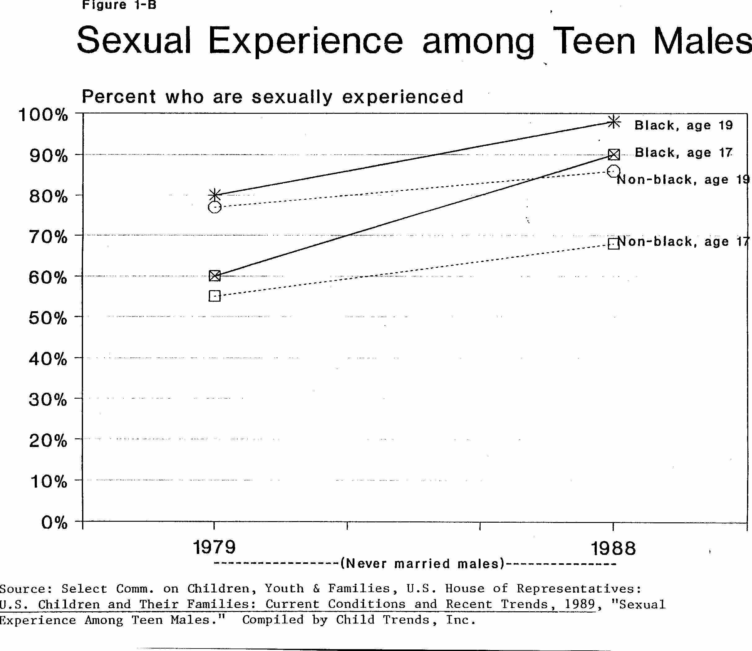 Among teen males, the story has been somewhat different. Figure 1-B depicts levels of sexual activity among male adolescents aged 17 and aged 19 between 1979 and 1988. By age 17, a majority of males are sexually experienced -- two in three non-blacks and nine in ten blacks. By age 19, 85% of non-blacks and nearly all blacks have had sex. These proportions represent substantial increases over the proportions recorded in 1979 for both race groups. While the percentage who are experienced has gone up for non-black youth, it has risen even more quickly for the black youth, to the point where slightly more black 17-year-olds have had intercourse than non-black 19-year-olds. ("Non-black" includes not only "whites" but also hispanics and other minorities.)