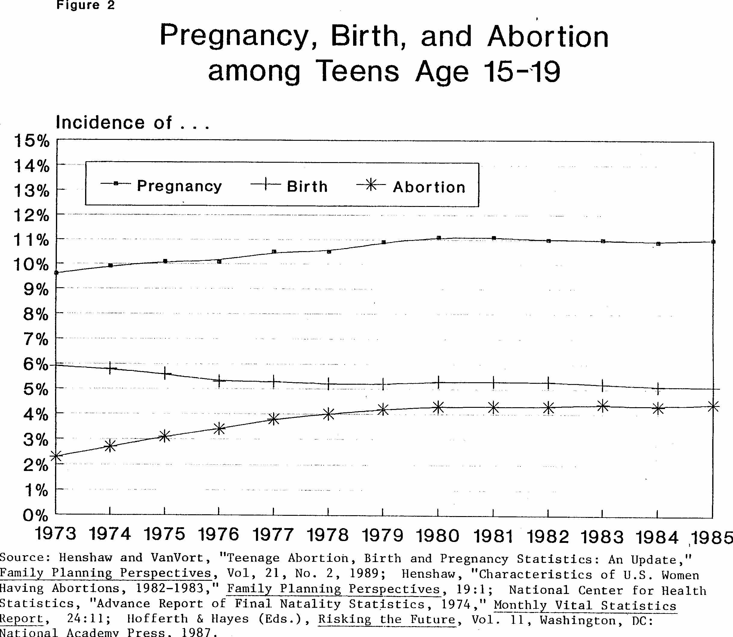 Figure 2 presents trend data on the incidence of pregnancy, childbearing, and abortion, among teens aged 15 to 19 during the years 1973 through 1985. (1985 is the most recent year for which abortion data are available. Since data on abortion are essential for the estimation of pregnancy, more recent trends cannot be estimated.)