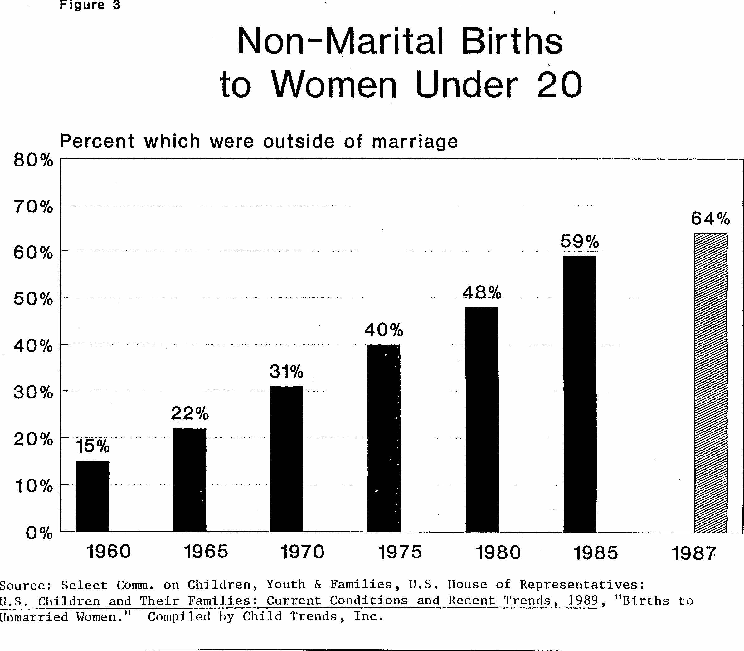 Among mothers younger than age 20, the percentage of births that occurred outside marriage went up 7 to 11 points every five years from 1960 to 1985. As of 1987, nearly two-thirds of teen births were non-marital; moreover, the proportion has risen every single year since 1960. This dramatic increase should be taken not as an illustration of rising rates of teen pregnancy but, rather, as an indication of the shrinking proportion of teen mothers who are married when they give birth.