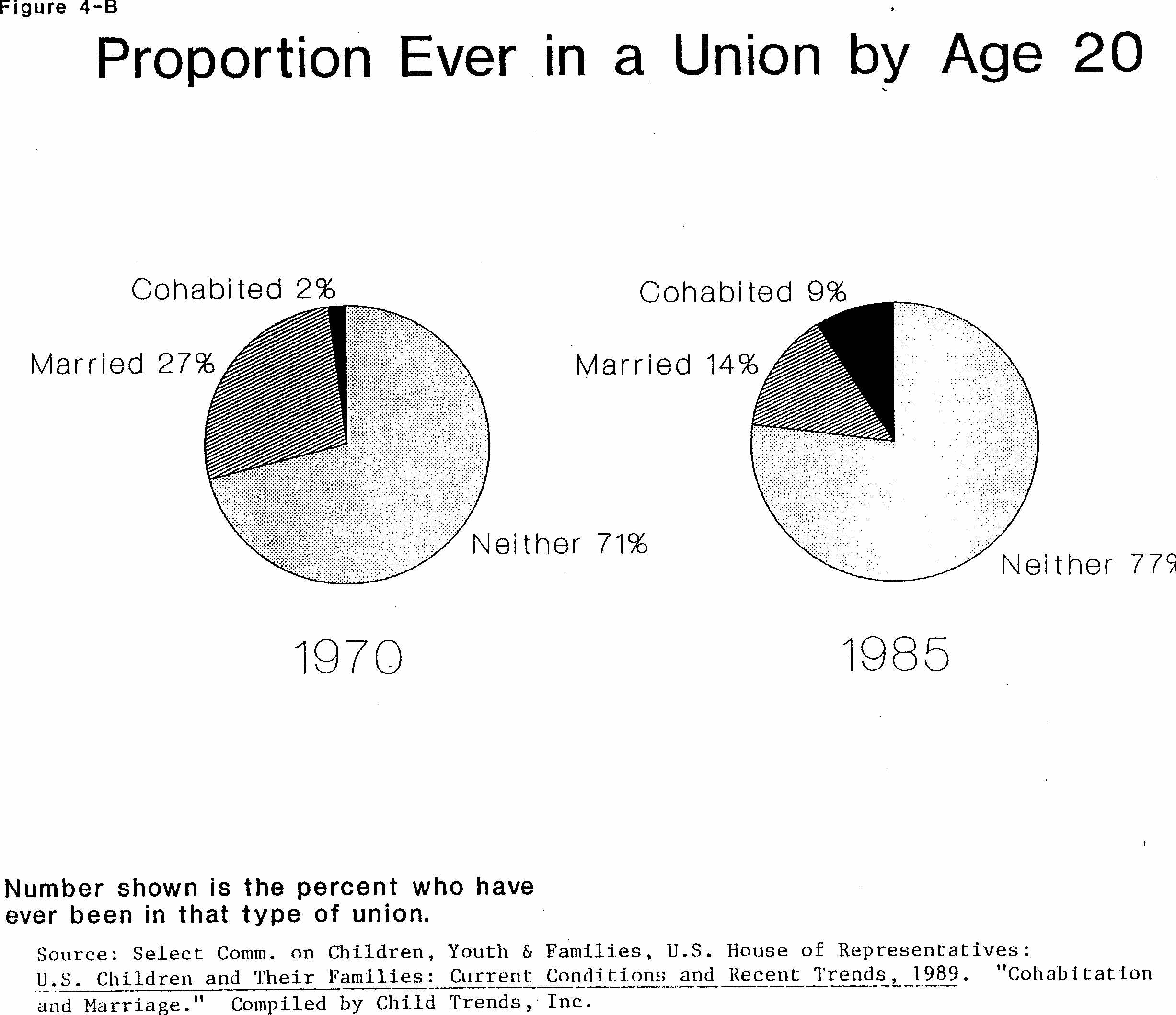 On the other hand, "never-married" does not necessarily mean "never lived in a union." As shown in Figure 4-B, in 1985, only 14 percent of youth had married by age 20, but an additional 9 percent had cohabited, resulting in 23 percent having been in a union before age 20. While the proportion of youth who have married by age 20 displayed more than a 50-percent decrease between 1970 and 1985 -- from 27 percent to 14 percent -- the proportion who have always lived a single lifestyle rose by less than 10 percent (see Figure 4-B.) This disparity is explained by the increase in cohabitation by age 20, which jumped from 2 percent in 1970 to 9 percent in 1985.