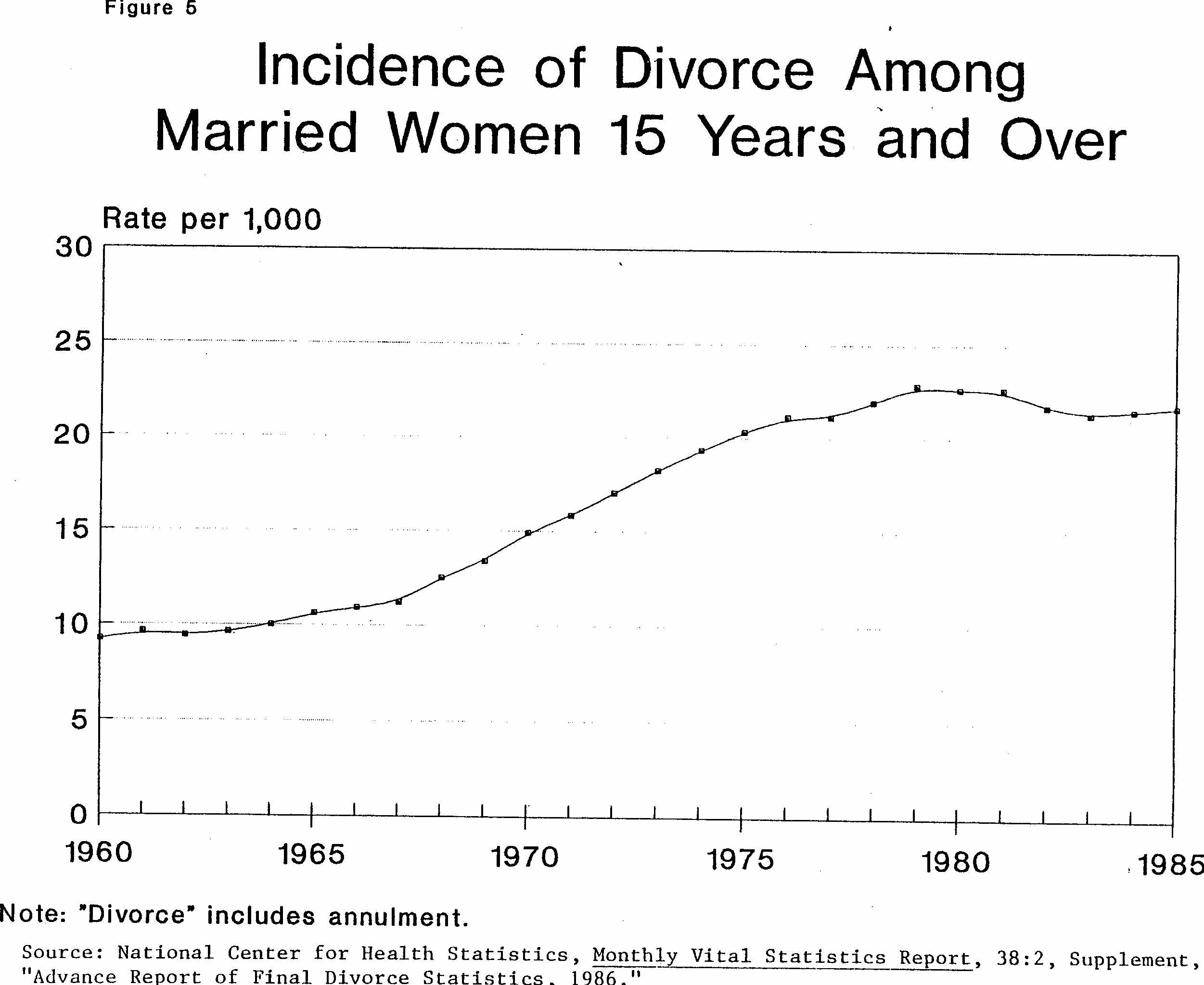The remarkable rise in the incidence of divorce in the United States is summarized in Figure 5. The rate per 1,000 married women shot up from roughly 9 in 1960 to 23 in 1979. While the divorce rate has leveled off during the eighties, it has levelled off at a plateau twice as high as the divorce rate in the 1960s.
