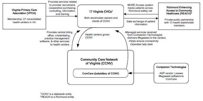 Ongoing roll-out. In 2004, having secured funding for a broader EHR implementation through the ICT grant, HCN began working closely with WebMD on additional customizations. As with Medical Manager, HCN’s significant market share allowed the network to negotiate a strong partnership with WebMD around EHR. WebMD has subsequently used customizations developed in conjunction with HCN to expand the scope of functionality it can make available to the wider health center and private provider market.