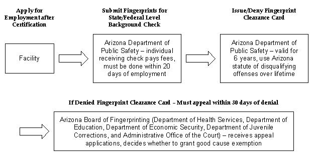 In Arizona, the Department of Health Services has guidelines for child care facilities to follow. The department requires that an applicant for a license to run a child care facility must submit all credentials, along with a copy of a two fingerprints and criminal history release form. In addition, the licensee must ensure that each staff member at the facility submit two fingerprints to the Department of Public Safety within seven working days after becoming a staff member.
