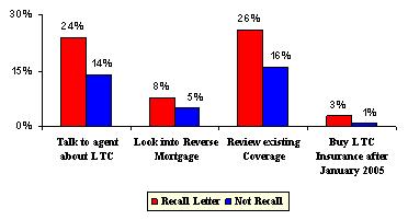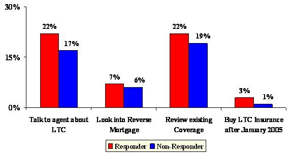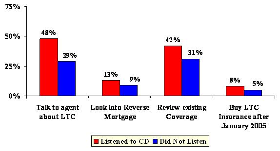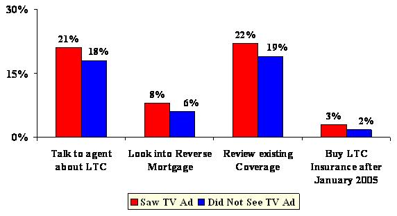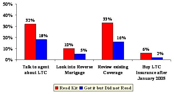 Both groups (those receiving Planning Kit and those who did not) have been exposed to a great deal of long-term care information in the media and mail over the duration of the campaign. However, those receiving the Planning Kit were nearly twice as likely to take any action as a result of what they saw, read, or heard. Specifically, individuals who received the Planning Kit were nearly twice as likely to buy long-term care insurance after the campaign as those who did not receive the Kit. They were also more likely to take other planning actions, including evaluating their existing insurance coverage to see if it covered long-term care, to consult with a financial planner or agent, or to look into a reverse mortgage.