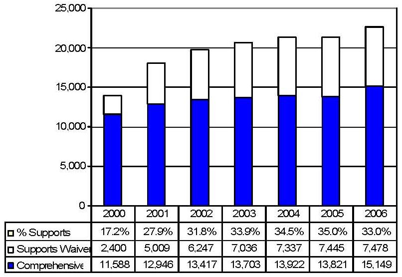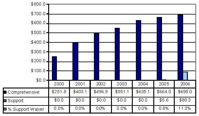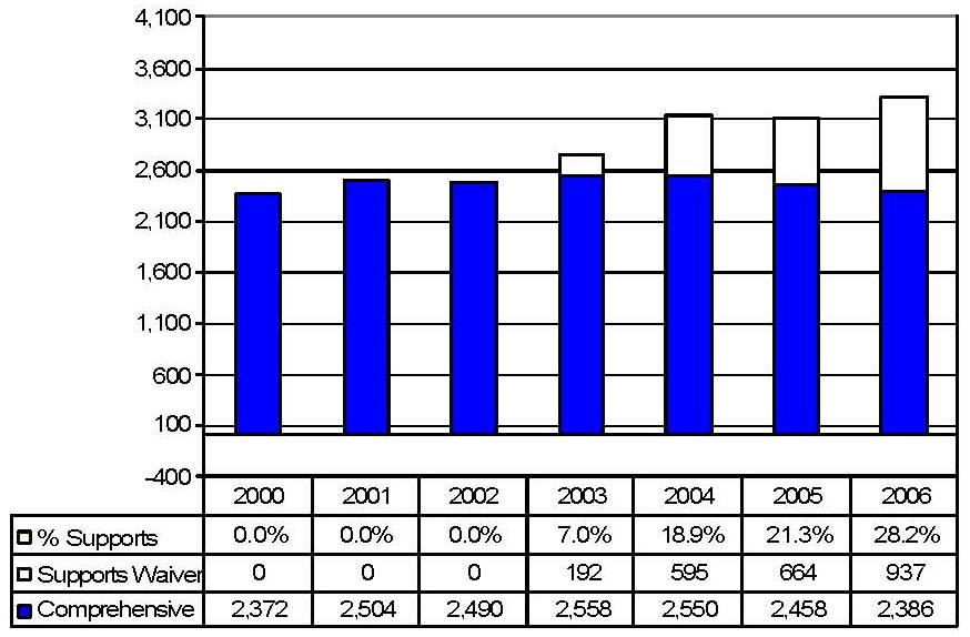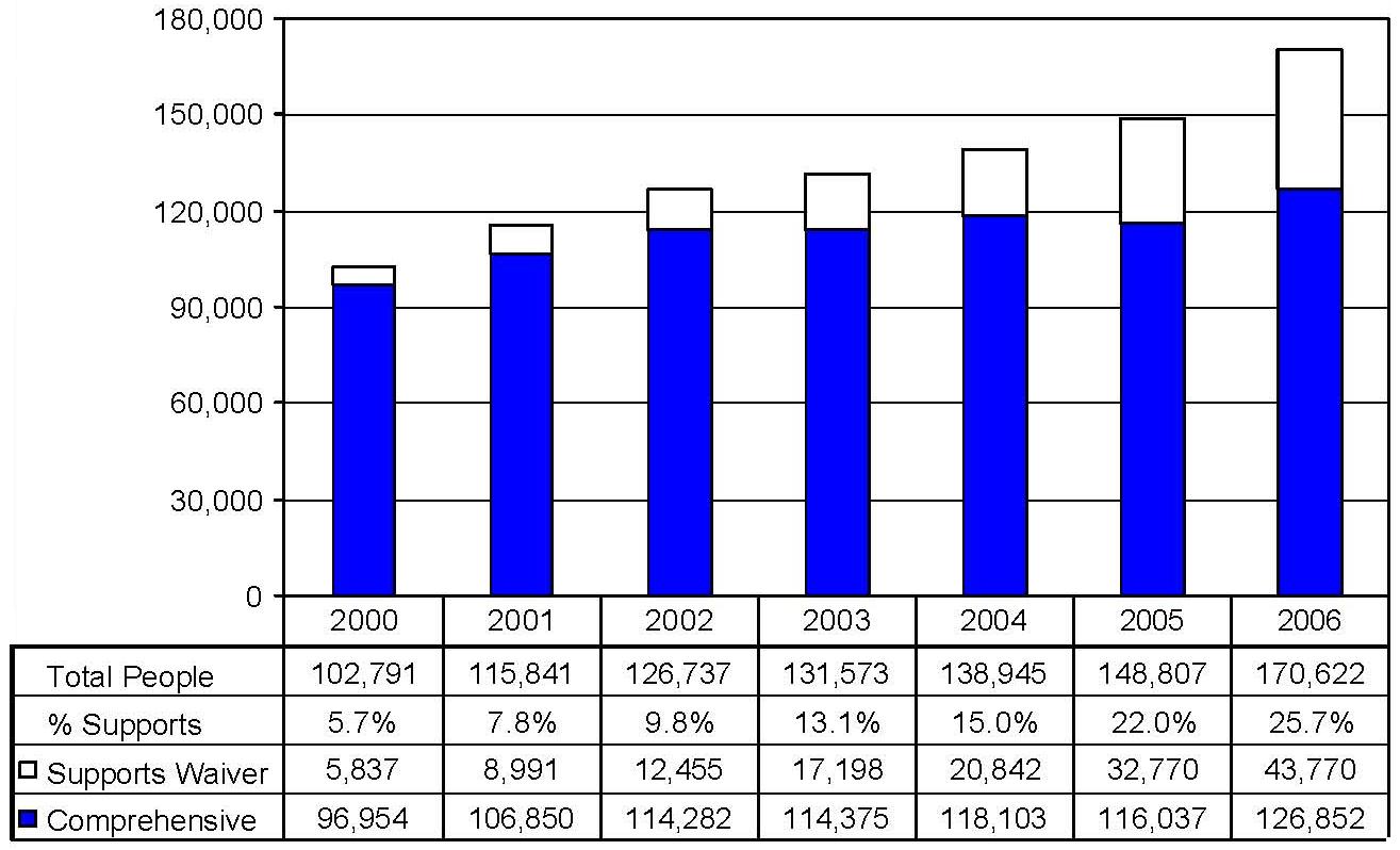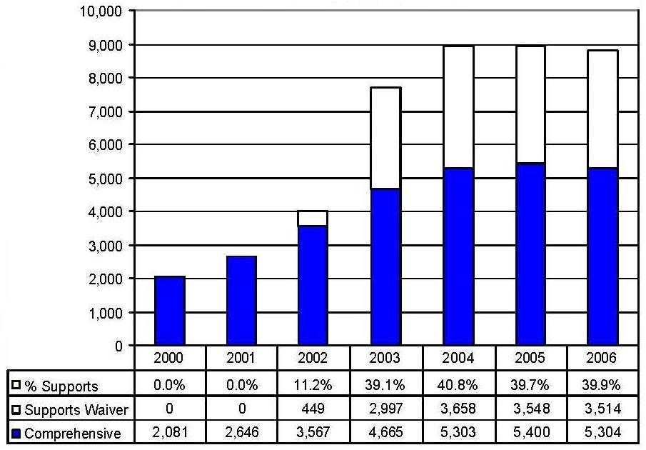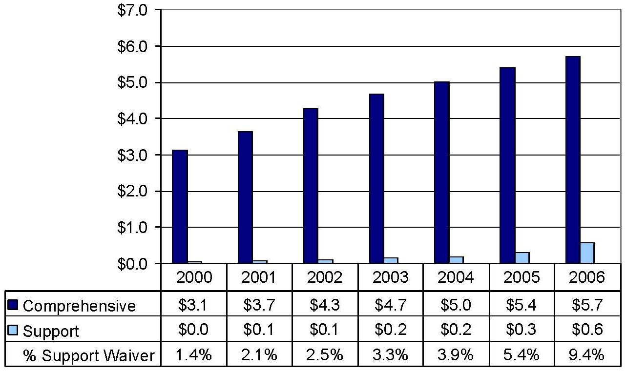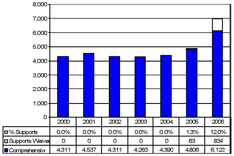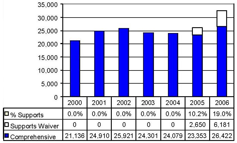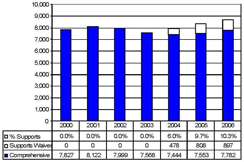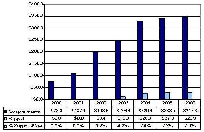 Statistical Profile: This section provides information on comprehensive and supports waivers regarding the number of participants served by waiver and associated costs. In most instances, the data depict waiver utilization and expenditures during the period 2000-2006. In some instances, data were only available through 2005; in a few cases, states provided out year projections. Complementing graphics are also presented to illustrate changes over the period.