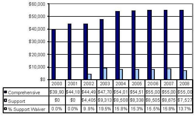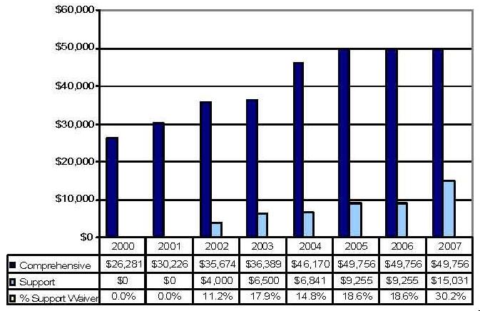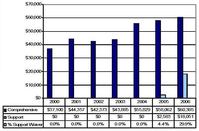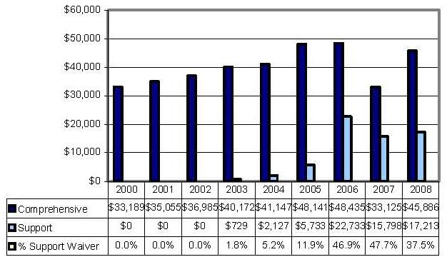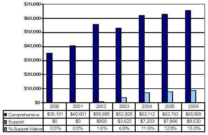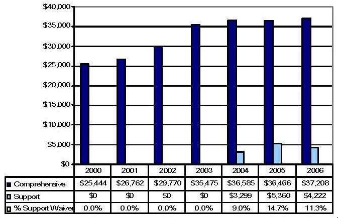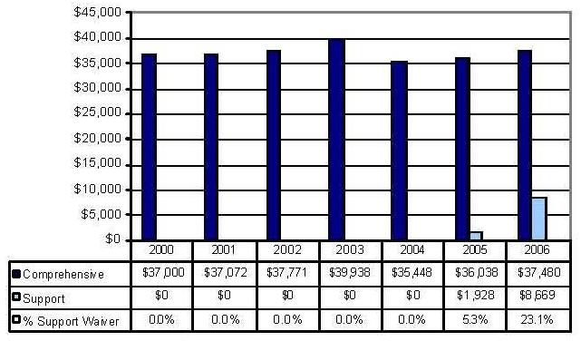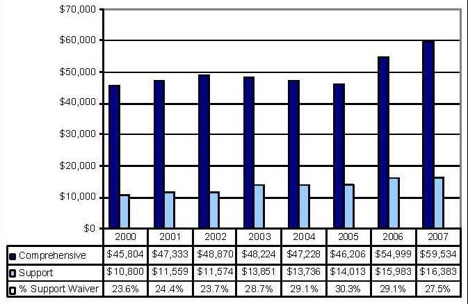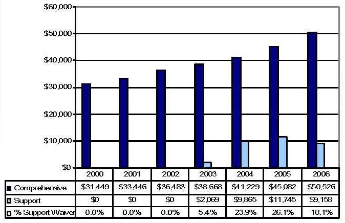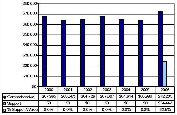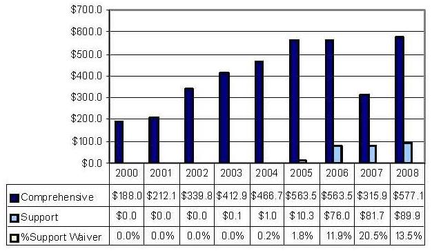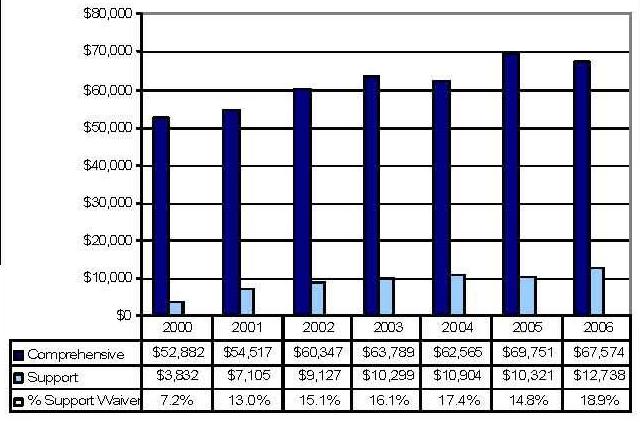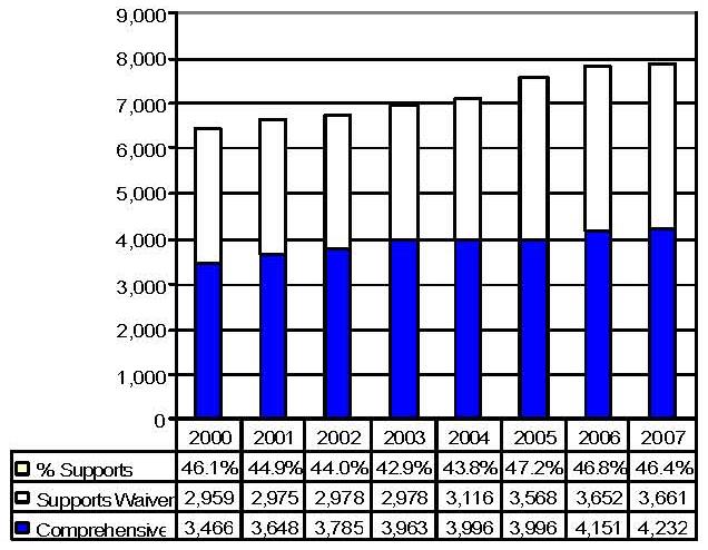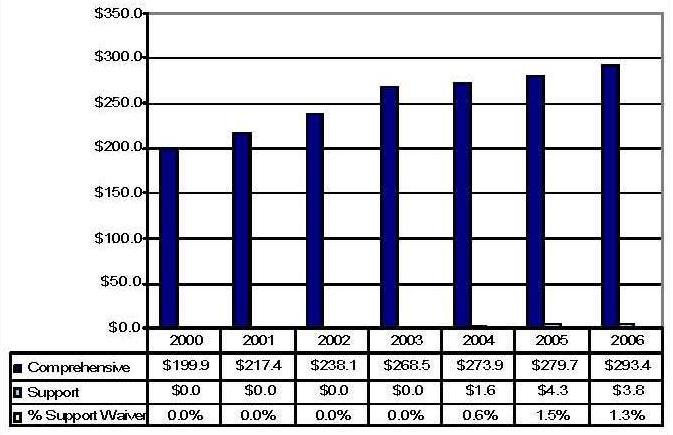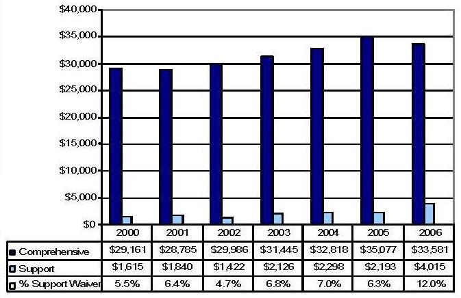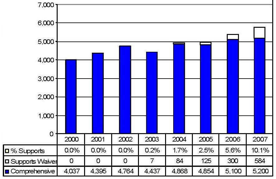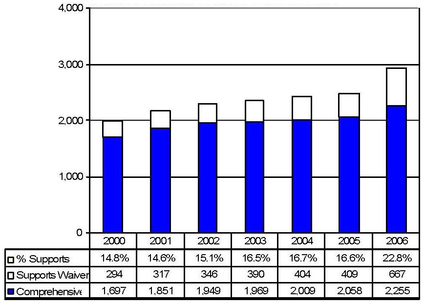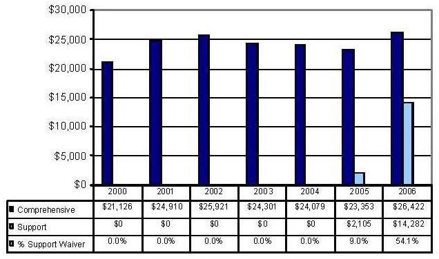 Statistical Profile: This section provides information on comprehensive and supports waivers regarding the number of participants served by waiver and associated costs. In most instances, the data depict waiver utilization and expenditures during the period 2000-2006. In some instances, data were only available through 2005; in a few cases, states provided out year projections. Complementing graphics are also presented to illustrate changes over the period.