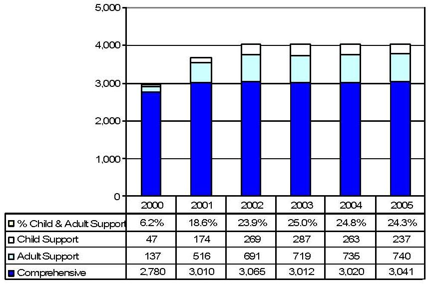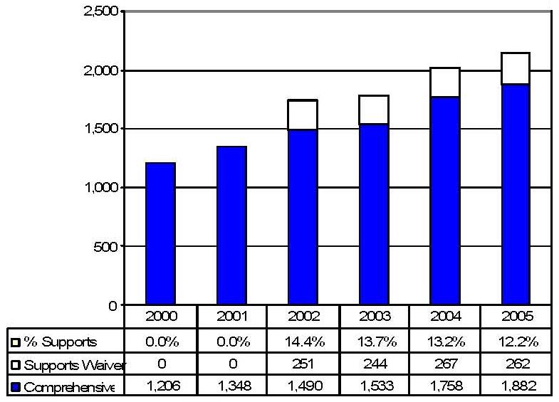 During the period 2000-2005, waiver enrollment in Washington increased by 12.8%. The drop in comprehensive waiver enrollment in 2005 is an outgrowth of the redistribution of CAP Waiver participants to the new waivers.