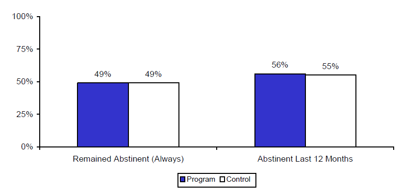 Sexual Abstinence. Program and control group youth were equally likely to have remained abstinent (). About half of both groups of youth reported remaining sexually abstinent, and a slightly higher proportion reported having been abstinent within the 12 months prior to the final follow-up survey (56 percent of program group youth versus 55 percent of control group youth; this difference was not statistically significant).