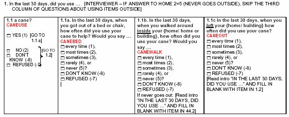 Assistive Device Use. With respect to assistive device use, there has been a proliferation of questions, using diverse terminology and varying levels of detail. Based on the pilot test, the research team recommended avoiding the terms special, assistive technology, and assistive devices, and instead using the phrase items that make your daily activities easy, safer, or so you can do them on your own; naming specific devices and providing definitions as needed; giving specific time frames for use (e.g., in the last 30 days); and not restricting questions to people who report having difficulty. For nonmobility devices, they recommend asking In the last 30 days have you used (name item). For mobility devices, they recommended a series of questions to capture frequency of use by task and location. For example: