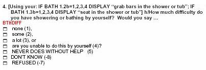 Home Environment. Existing measures of barriers in the home environment are generally found on long home assessment forms used by trained professionals. They rely on subjective assessments of whether features are causing problems. Surveys on the other hand have generally asked few questions about the home environment. Based on the cognitive testing and pilot results the research team recommended a series of questions (approximately 2 minutes) to capture home features. The items distinguish the existence, acquisition, and use of these features. For example: