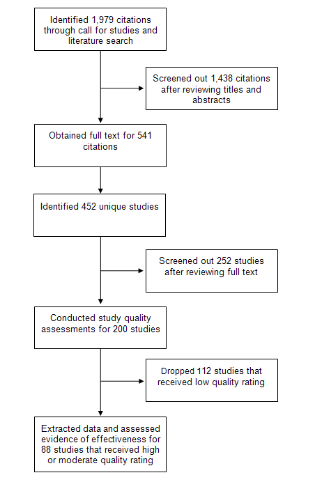More than 1,900 citations were found through the literature search (Figure 1). From this initial citation list, 1,438 (73 percent) were screened out by title and abstract. Full text articles were obtained for 541 citations, and from these citations, the review team identified 452 unique studies. An additional 252 studies were screened out after reviewing the full text, and 112 studies were dropped for failing to meet the review criteria for a high or moderate study quality rating. A total of 88 studies met the review criteria for a high or moderate rating and were included in the final data extraction and analysis.
