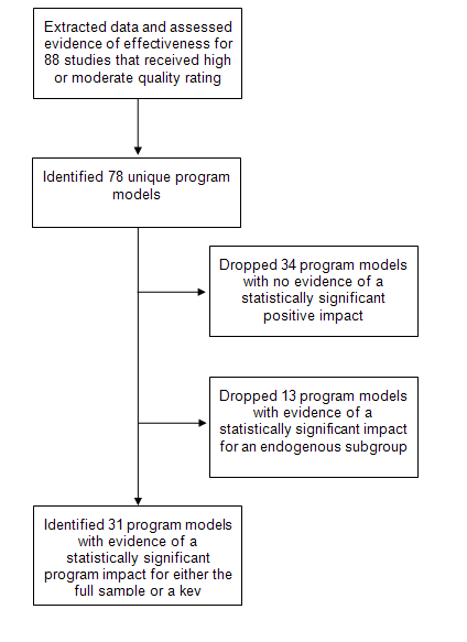 | Results: A total of 88 studies met the review criteria for study quality and were included in the data extraction and analysis. The studies examined a range of program models delivered in diverse settings. Most studies had mixed-gender and predominately African American research samples (70 percent and 51 percent, respectively). Randomized controlled trials accounted for the large majority (87 percent) of included studies. Most studies (76 percent) included multiple follow-ups, with sample sizes ranging from 62 to 5,244. Analysis of the study impact findings identified 31 program models with evidence of a statistically significant positive effect (and no adverse effects) on teen pregnancy, STIs, or sexual activity. |