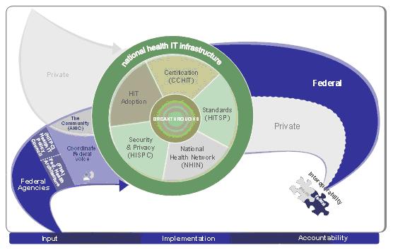 In July 2004, the Office of the National Coordinator for Health Information Technology (ONCHIT) in HHS released a report, "The Decade of Health Information Technology: Delivering Consumer-Centric and Information-Rich Health Care" (Office for the National Coordinator for Health Information Technology, 2004). The report outlines a framework for realizing the goal that most Americans have an interoperable EHR by 2014. The report identifies four critical goals with three strategies to achieve each goal: