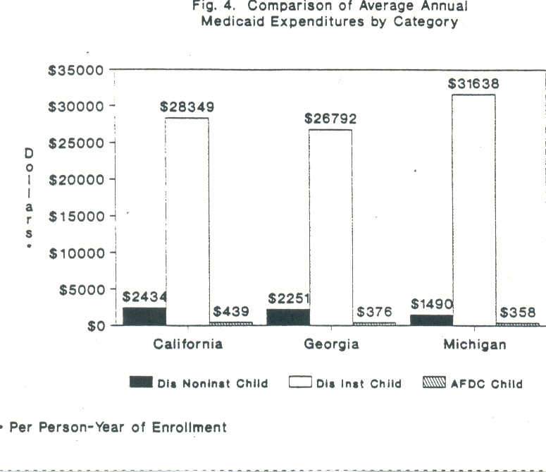 The annual Medicaid expenditure per institutionalized disabled child ranged from $26,792 in Georgia to $31,638 in Michigan, with California in between at $28,349, with most of the cost attributable to long-term care. ICF-MR care accounted for more than half the expenditures for institutionalized in all three study states.