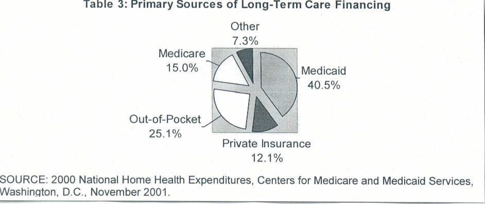 Medicaid, jointly funded by federal and state government and administered by the states, is the largest source of funding for long-term care services (see Table 3). Reimbursement by Medicaid programs creates the framework within which employers set wages for direct-care workers.