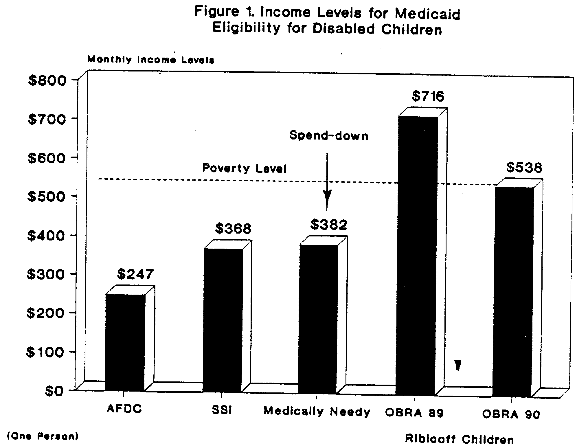 Thus, as shown in Figure 1, different financial levels are used to determine Medicaid eligibility for children, dependent on the categorical group under which they are qualifying. For Ribicoff children, age also makes a difference. Figure 1 does not represent any one State, but instead depicts in a general fashion w ere median State financial eligibility levels for children were in 1989.