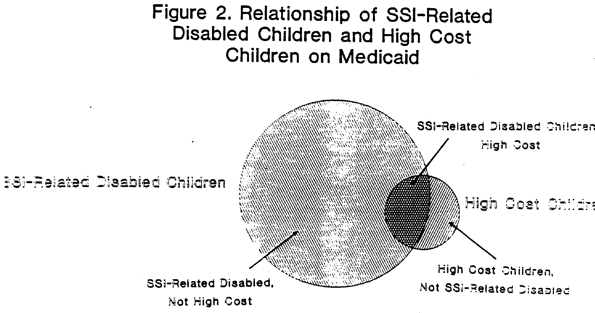 High cost Medicaid children were about 0.2% of total Medicaid recipients among the study States, while SSI-related disabled children were 1%-3%. There was some overlap between the two groups. About half of the high cost children in each State passed the SSI disability test. However, the vast majority of SSI-related children were not high cost, i.e. they did not have annual Medicaid expenditures of $25,000 a year or more. Figure 2 below shows the general relationship between high cost Medicaid children and SSI-related Medicaid children.