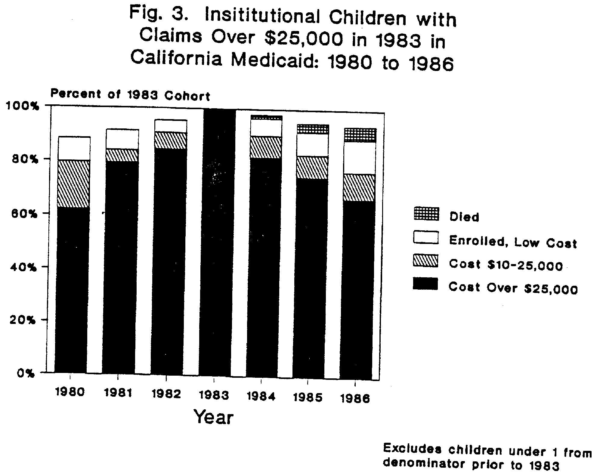 The longitudinal analysis in California showed that high cost institutionalized children were likely to main institutionalized and remain high cost, as shown in Figure 3. In 1986, about 90% of the 1983 cohort were still enrolled in Medicaid, and 67% still had Medicaid expenditures of $25,000 or more per year. The 7 year cumulative Medicaid cost (1980 through 1986) for institutionalized children who were in the high cost group in 1983 in California averaged $328,819 per child.
