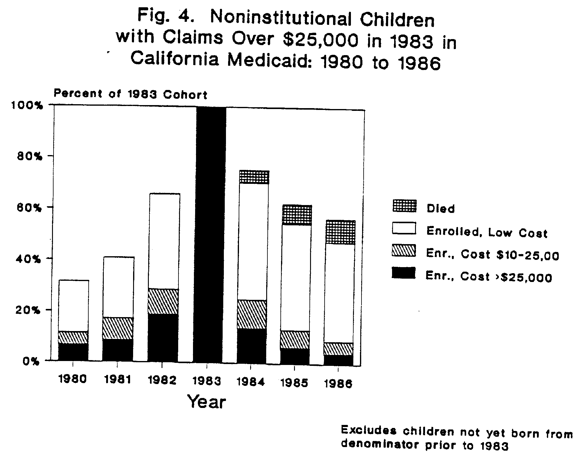The longitudinal analysis in California showed that about one-third of the noninstitutionalized high cost children in 1983 were new entrants to Medicaid, a higher than expected rate with normal caseload turnover and growth. Figure 4 shows that only about half of these children were still enrolled in Medicaid by 1986, and about 10% were deceased. Most noninstitutionalized high cost children in 1983 were not persistently high cost. Only 9% continued to have Medicaid expenditures of $10,000 or more annually by 1986.