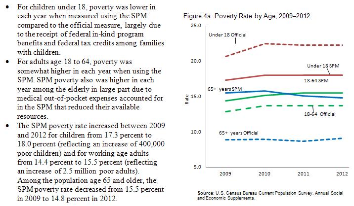 This brief summarizes data released by the Census Bureau on the research supplemental poverty measure. Cited statistics include poverty rates from 2009-2012 using both the official poverty measure and the supplemental poverty measure; the anti-poverty effectiveness of select social safety net programs for all persons and children 0-17; changes in poverty between 2009 and 2012 by age, race and ethnicity, family type, region, and residence; and changes in the SPM rate from 2009 to 2012 for selected demographic characteristics. The data are based on information collected in the 2013 and earlier Current Population Survey Annual Social and Economic Supplements (CPS ASEC) conducted by the Census Bureau.