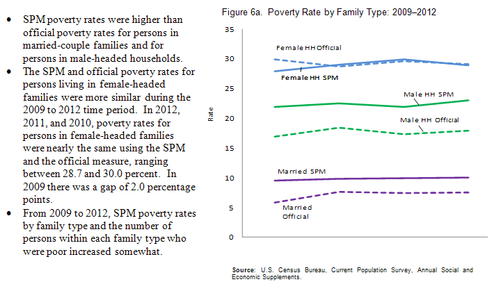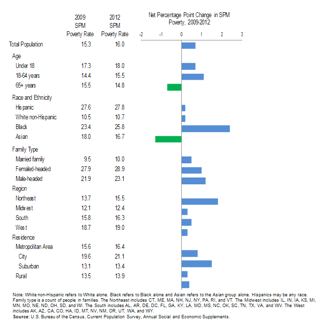 From 2009 to 2012 the Supplemental Poverty Rate increased by 0.7 percentage points for all persons. The SPM poverty rate increased somewhat more for adults ages 18-64, African American or Black persons, persons in female-headed and male-headed families, residents in the Northeast, and those living in cities. The SPM poverty rate decreased from 2009 to 2012 for adults ages 65 and older and for Asians.