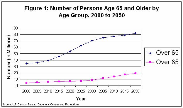 The aging of the birth cohorts born between 1945 and 1965 (the "baby boom" cohorts) will be the most significant factor increasing the demand for long-term care and supportive services over the next half century. As shown in Figure 1, the number of individuals who are age 65 and older is expected to more than double, increasing from 35 million in 2000 to over 86 million in 2050.1 As a result, nearly 21% of the population will be age 65 and over by the middle of the century.