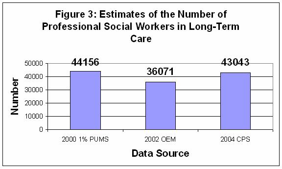 Estimates of the number of professional social workers from the 2002 BLS OEM, the 2004 CPS and the 2000 1% PUMS are presented in Figure 2. The numbers range from a low of 471,075 (2000 1% PUMS) to a high of 522,280 (2004 CPS), with the estimate from the 2002 OEM closer to the low end of the range. Focusing on professional social workers in long-term care settings yields a similarly narrow range of estimates--36,071 to 44,156 (Figure 3). The numbers likely vary due to differences in survey coverage, sampling variations, and differences in how a social worker is defined across the three data sources.