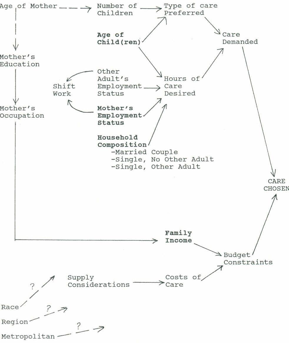 The overall observed demand for care is simply the aggregate of individual families' choices of care. Approaching the demand for child care at this micro-level requires asking: "What characteristics of the family, mother, and child influence their choice of care arrangements?" This section incorporates the implicit and explicit theories of the reviewed researchers and presents a conceptual model outlining the variables affecting the demand for child care.