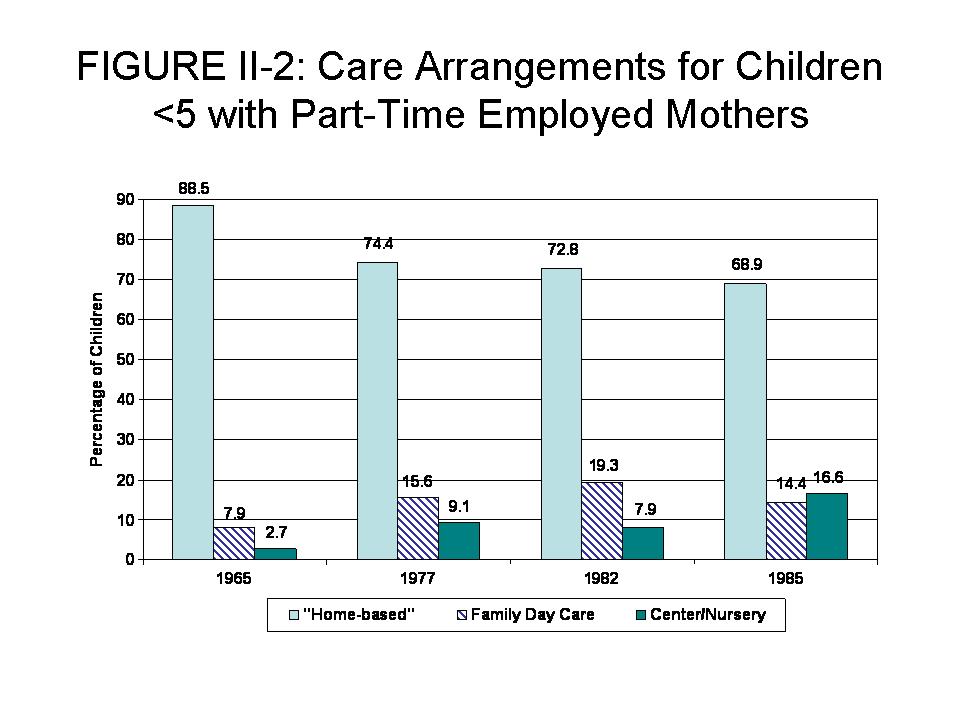 - FIGURE II-2. Care Arrangements for Children 5, with Part-Time Employed Mothers: 1958-1985